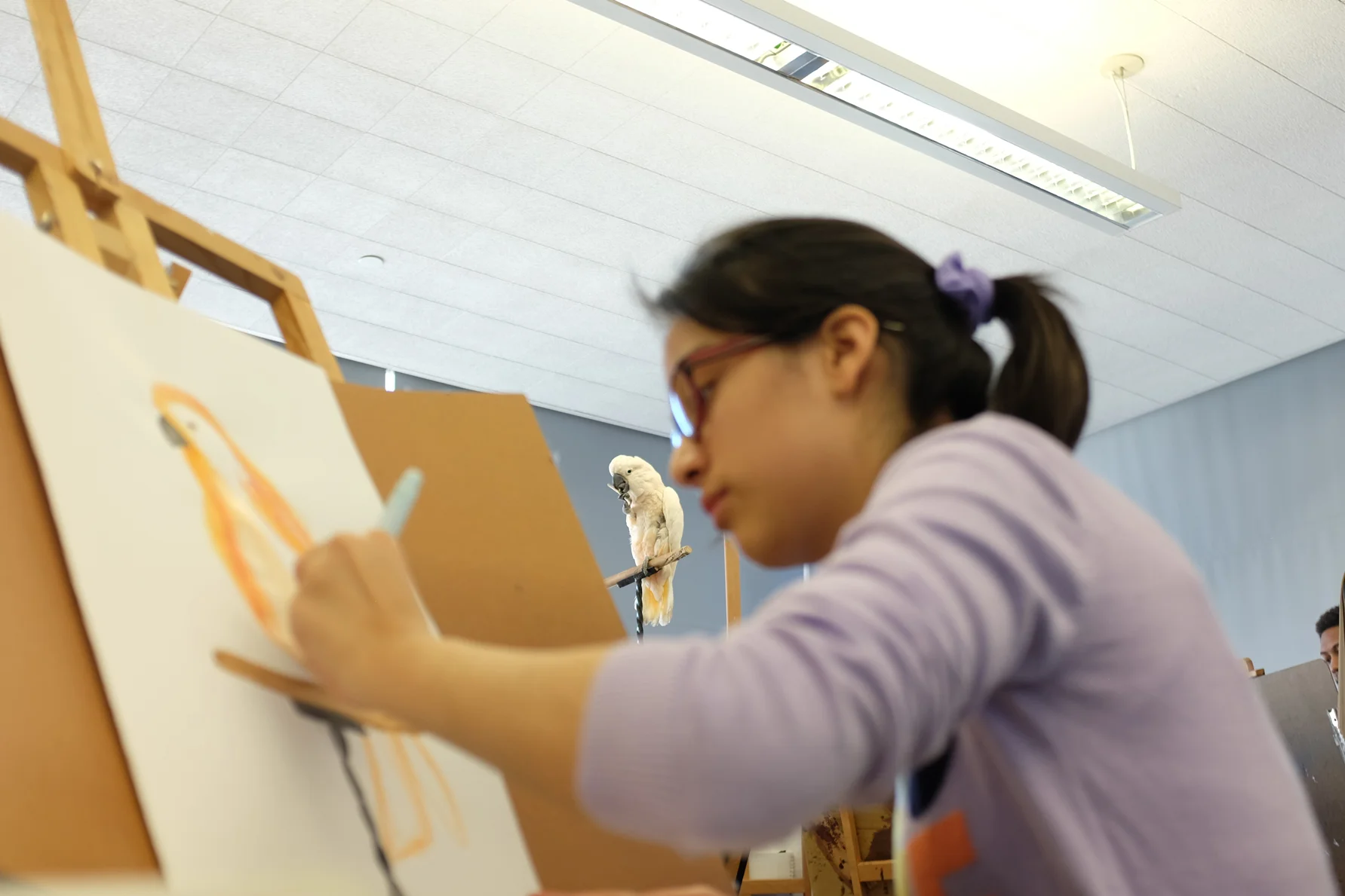 Pinkie, the talking parrot, from Pet Resources in the South Bronx, is spending the month of March integrating throughout the Frank Sinatra High School of the Arts in Astoria, Queens. This week she is the subject of a life drawing class.